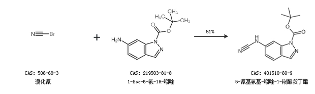 1.通过溴化氰和1-Boc-6-氨-1H-吲唑合成6-氰基氨基-吲唑-1-羧酸叔丁酯,收率约51%;