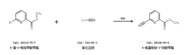 1.通过6-溴-2-吡啶甲酸甲酯和氰化亚铜合成6-氰基吡啶-2-羧酸甲酯,收率约49%;