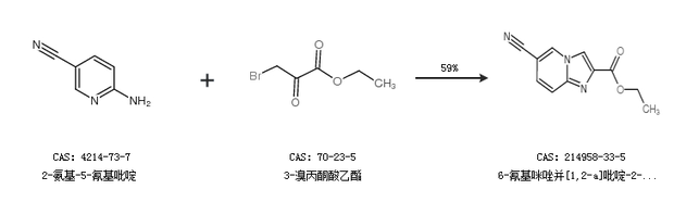 1.通过2-氨基-5-氰基吡啶和3-溴丙酮酸乙酯合成6-氰基咪唑并[1,2-a]吡啶-2-羧酸乙酯,收率约59%;