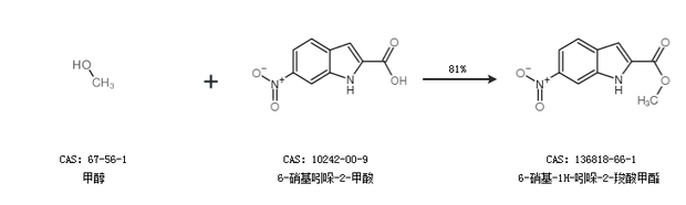 1.通过甲醇和6-硝基吲哚-2-甲酸合成6-硝基-1H-吲哚-2-羧酸甲酯,收率约81%;