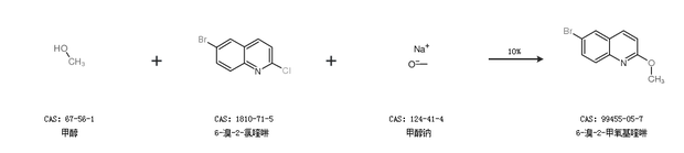 1.通过甲醇、6-溴-2-氯喹啉和甲醇钠合成6-溴-2-甲氧基喹啉,收率约10%;