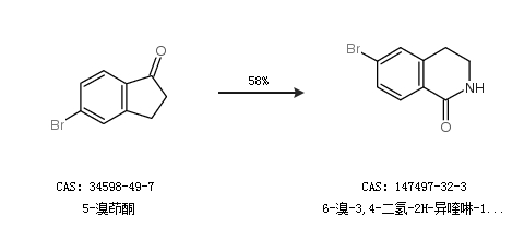 2.通过5-溴茚酮合成6-溴-3,4-二氢-2H-异喹啉-1-酮,收率约58%;