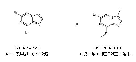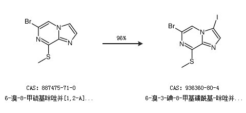 英文别名 6-bromo-3-iodo-8-(methylsulfanyl)imidazo[1,2-a]pyrazine;6-Bromo-3-iodo-8-(methylthio)imidazo[1,2-a]pyrazine;3-iodo-6-bromoimidazo[1,2-a]pyrazine;