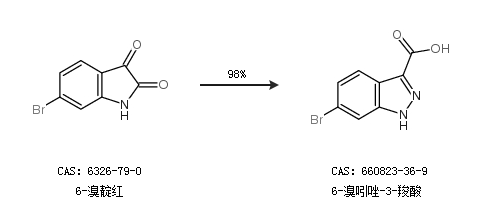 1.通过6-溴靛红合成6-溴吲唑-3-羧酸,收率约98%;