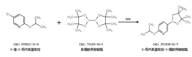 1.通过5-溴-2-异丙氧基吡啶和联硼酸频那醇酯合成6-异丙氧基吡啶-3-硼酸频哪醇酯,收率约58%;