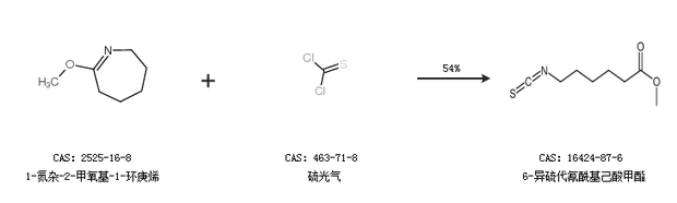 1.通过1-氮杂-2-甲氧基-1-环庚烯和硫光气合成6-异硫代氰酰基己酸甲酯,收率约54%;