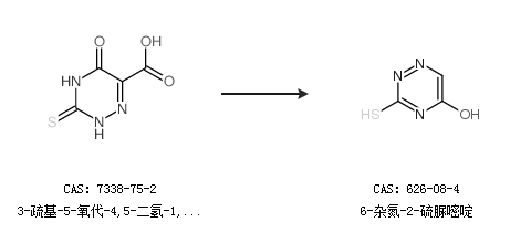 英文别名 3-thioxo-2,3,4,5-tetrahydro-1,2,4-triazin-5-one;5-xox-3-thio-2,3,4,5-tetrahydro-1,2,4-triazine;2-Thio-6-azauracil;1,2,4-triazin-3(2H)-thion-5(4H)-one;3-thio-1,2,4-triazine-3,5(2H,4H)-dione;3-thioxo-1,2,4-triazin-5-one;5-Hydroxy-3-mercapto-1,2,4-triazine;3-sulfanyl-1,2,4-triazin-5-ol;3-Thioxo-3,4-dihydro-1,2,4-triazin-5(2H)-one;3-thioxo-1,2,4-triazin-5(4H)-one;6-Aza-2-thiouracil;