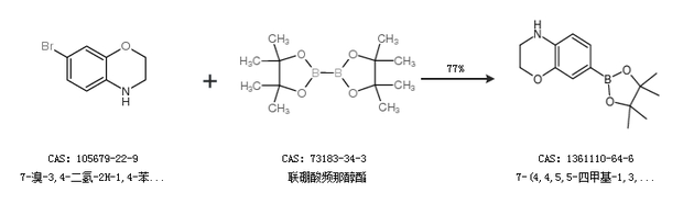 1.通过7-溴-3,4-二氢-2H-1,4-苯并恶嗪和联硼酸频那醇酯合成7-(4,4,5,5-四甲基-1,3,2-二噁硼烷-2-基)-3,4-二氢-2H-苯并[b][1,4]噁嗪,收率约77%;