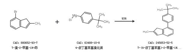 1.通过7-溴-2-甲基-1H-茚和4-叔丁基苯基溴化镁合成7-(4-叔丁基苯基)-2-甲基-1H-茚,收率约93%;