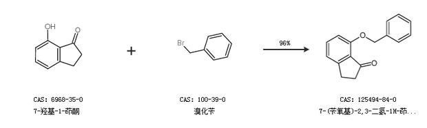 2.通过7-羟基-1-茚酮和溴化苄合成7-(苄氧基)-2,3-二氢-1H-茚-1-酮,收率约96%;