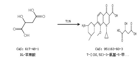 1.通过DL-苹果酸合成7-[(3S,5S)-3-氨基-5-甲基-1-哌啶基]-1-环丙基-1,4-二氢-8-甲氧基-4-氧代-3-喹啉甲酸 2-羟基丁二酸,收率约71%;