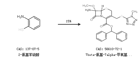 1.通过2-氨基苯硫醇合成7beta-氨基-7alpha-甲氧基-3-(1-甲基-1H-四唑-5-硫甲基)-8-氧代-5-硫-1-杂氮双环[4.2.0]辛-2-烯-2-甲酸二苯基甲酯,收率约15%;