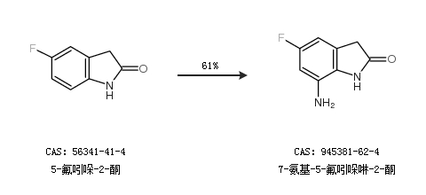 1.通过5-氟吲哚-2-酮合成7-氨基-5-氟吲哚啉-2-酮,收率约61%;