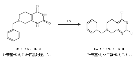 1.通过7-苄基-5,6,7,8-四氢吡啶并[3,4-D]嘧啶-2,4(1H,3H)-二酮合成7-苄基-2,4-二氯-5,6,7,8-四氢吡啶并[3,4-D]嘧啶,收率约33%;