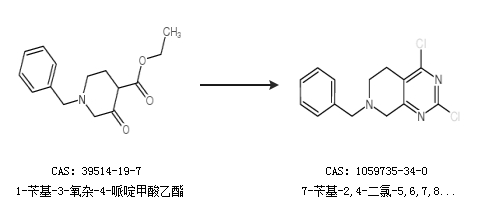 2.通过1-苄基-3-氧杂-4-哌啶甲酸乙酯合成7-苄基-2,4-二氯-5,6,7,8-四氢吡啶并[3,4-D]嘧啶