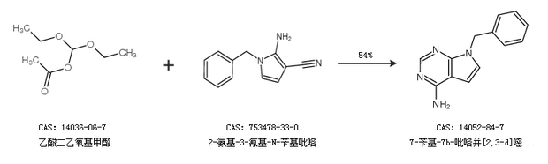 1.通过乙酸二乙氧基甲酯和2-氨基-3-氰基-N-苄基吡咯合成7-苄基-7h-吡咯并[2,3-d]嘧啶-4-胺,收率约54%;