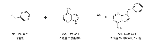2.通过苄基氯和6-氨基-7-氮杂嘌呤合成7-苄基-7h-吡咯并[2,3-d]嘧啶-4-胺,收率约53%;