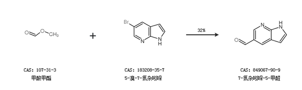 1.通过甲酸甲酯和5-溴-7-氮杂吲哚合成7-氮杂吲哚-5-甲醛,收率约32%;