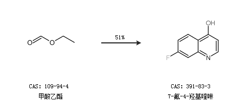 2.通过甲酸乙酯合成7-氟-4-羟基喹啉,收率约51%;