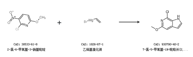 1.通过2-氯-6-甲氧基-3-硝基吡啶和乙烯基溴化镁合成7-氯-5-甲氧基-1H-吡咯并[2,3-c]吡啶