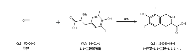 1.通过甲醛和3,5-二碘酪氨酸合成7-羟基-6,8-二碘-1,2,3,4-四氢异喹啉-3-羧酸,收率约42%;