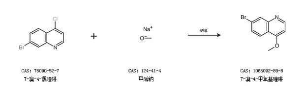 1.通过7-溴-4-氯喹啉和甲醇钠合成7-溴-4-甲氧基喹啉,收率约49%;