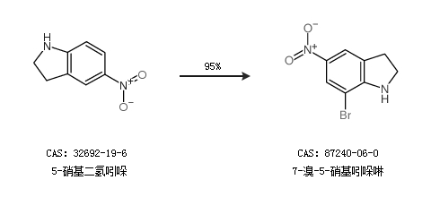 1.通过5-硝基二氢吲哚合成7-溴-5-硝基吲哚啉,收率约95%;