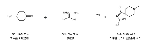 1.通过N-甲基-4-哌啶酮和碳酸铵合成8-甲基-1,3,8-三氮杂螺[4.5]癸烷-2,4-二酮,收率约49%;