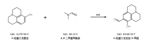 1.通过8-羟基久洛里定和N,N-二甲基甲酰胺合成8-羟基久洛尼定-9-甲醛,收率约94%;