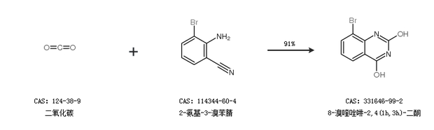 1.通过二氧化碳和2-氨基-3-溴苯腈合成8-溴喹唑啉-2,4(1h,3h)-二酮,收率约91%;