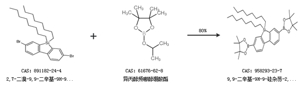 英文别名 9,9-dioctyl-2,7-bis(4,4,5,5-tetramethyl-1,3,2-dioxaborolane-2-yl)dibenzosilole;5,5-Dioctyl-3,7-bis(4,4,5,5-tetramethyl-1,3,2-dioxaborolan-2-yl)-5H-dibenzo[b,d]silole;3,7-bis(4,4,5,5-tetramethyl-1,3,2-dioxaborolane-2-yl)-5,5-dioctyl-dibenzo[b,d]silole;2,7-bis(4,4,5,5-tetramethyl-1,3,2-dioxaborolan-2-yl)-9,9''-di-n-octyldibenzosilole;