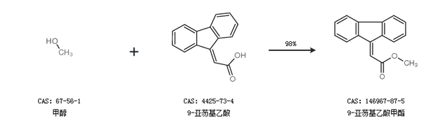 1.通过甲醇和9-亚芴基乙酸合成9-亚芴基乙酸甲酯,收率约98%;