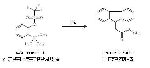 2.通过2-(三甲基硅)苯基三氟甲烷磺酸盐合成9-亚芴基乙酸甲酯,收率约78%;