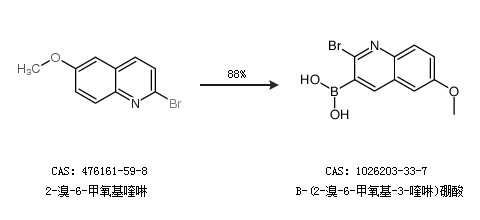 1.通过2-溴-6-甲氧基喹啉合成B-(2-溴-6-甲氧基-3-喹啉)硼酸,收率约88%;