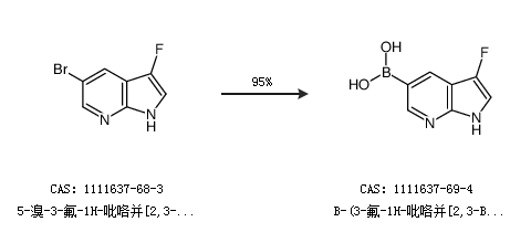 1.通过5-溴-3-氟-1H-吡咯并[2,3-B]吡啶合成B-(3-氟-1H-吡咯并[2,3-B]吡啶-5-基)-硼酸,收率约95%;