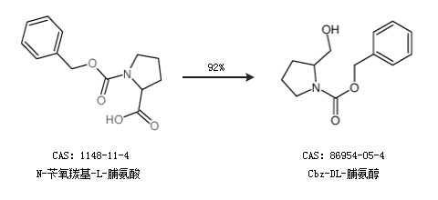 1.通过N-苄氧羰基-L-脯氨酸合成Cbz-DL-脯氨醇,收率约92%;