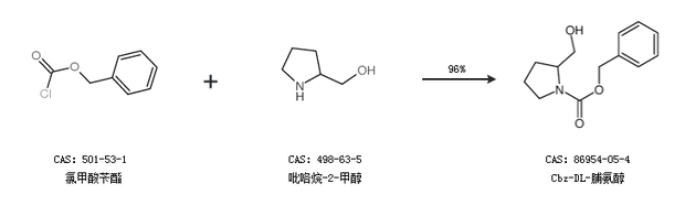 2.通过氯甲酸苄酯和吡咯烷-2-甲醇合成Cbz-DL-脯氨醇,收率约96%;