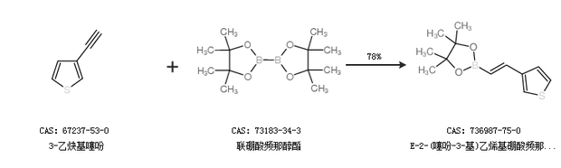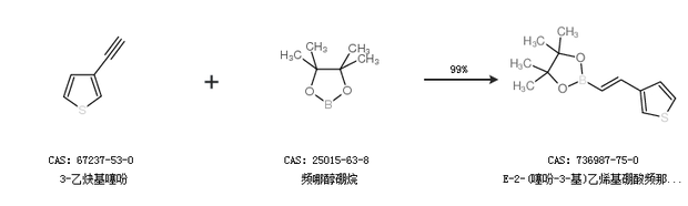 2.通过3-乙炔基噻吩和频哪醇硼烷合成E-2-(噻吩-3-基)乙烯基硼酸频那醇酯,收率约99%;