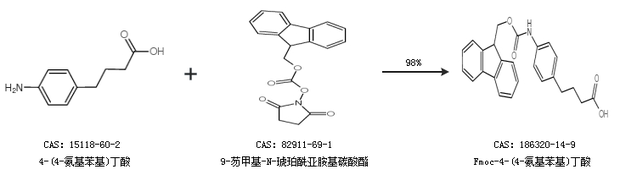 1.通过4-(4-氨基苯基)丁酸和9-芴甲基-N-琥珀酰亚胺基碳酸酯合成Fmoc-4-(4-氨基苯基)丁酸,收率约98%;