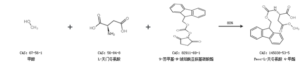 1.通过甲醇、L-天门冬氨酸和9-芴甲基-N-琥珀酰亚胺基碳酸酯合成Fmoc-L-天冬氨酸 4-甲酯,收率约80%;