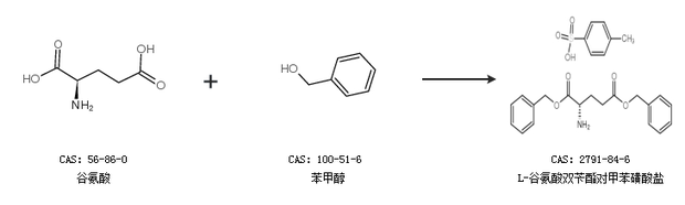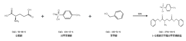 1.通过谷氨酸、对甲苯磺酸和苯甲醇合成L-谷氨酸双苄酯对甲苯磺酸盐,收率约90%;