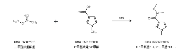 1.通过二甲羟胺盐酸盐和1-甲基吡唑-3-甲酸合成N -甲氧基- N,1-二甲基-1H -吡唑- 3 -甲酰胺,收率约97%;