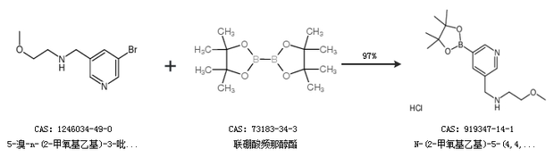1.通过5-溴-n-(2-甲氧基乙基)-3-吡啶甲胺和联硼酸频那醇酯合成N-(2-甲氧基乙基)-5-(4,4,5,5-四甲基-1,3,2-二噁硼烷-2-基)-3-吡啶甲胺,收率约97%;