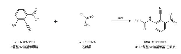 1.通过2-氨基-6-硝基苯甲腈和乙酰氯合成N-(2-氰基-3-硝基苯基)乙酰胺,收率约69%;