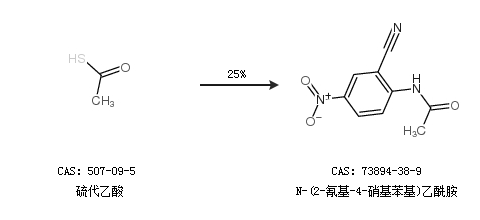1.通过硫代乙酸合成N-(2-氰基-4-硝基苯基)乙酰胺,收率约25%;