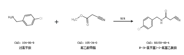 2.通过对氯苄胺和氰乙酸甲酯合成N-(4-氯苄基)-2-氰基乙酰胺,收率约91%;