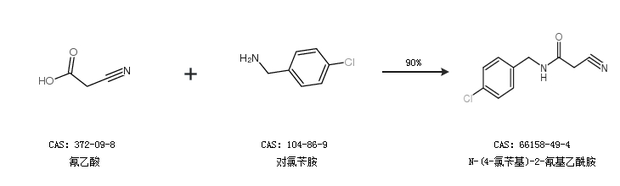 1.通过氰乙酸和对氯苄胺合成N-(4-氯苄基)-2-氰基乙酰胺,收率约90%;