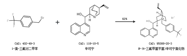 1.通过1-溴-三氟对二甲苯和辛可宁合成N-(4-三氟甲基苄基)辛可宁溴化物,收率约62%;