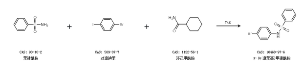 1.通过苯磺酰胺、对溴碘苯和环己甲酰胺合成N-(4-溴苯基)甲磺酰胺,收率约74%;