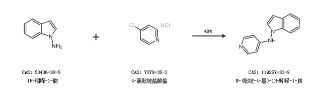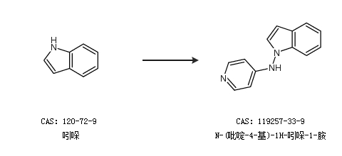 1.通过1H-吲哚-1-胺和4-氯吡啶盐酸盐合成N-(吡啶-4-基)-1H-吲哚-1-胺,收率约49%;